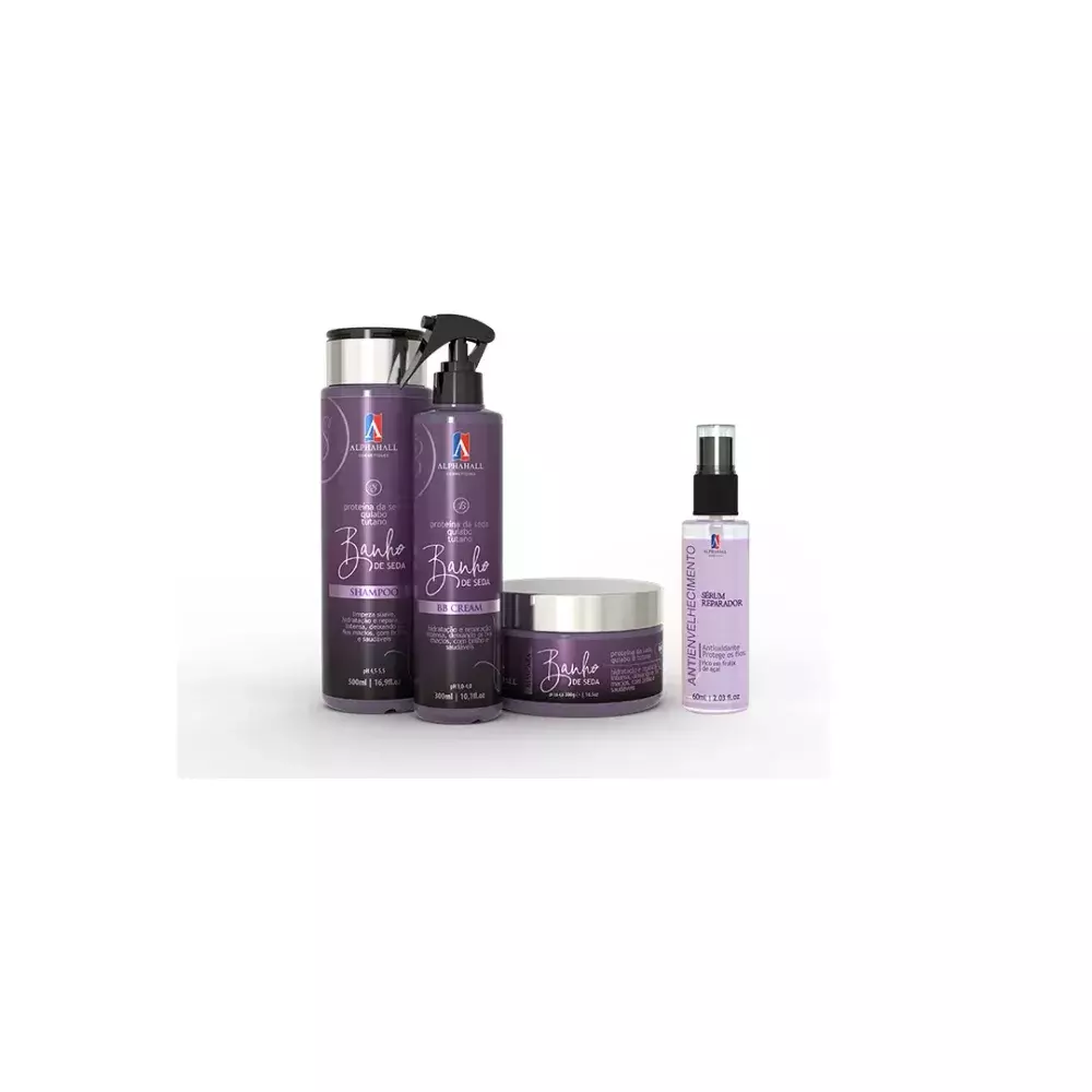 O KIT CONTÉM: - Shampoo Banho de Seda (500ml):contém proteínas que garantem uma limpeza suave. - Máscara Banho de Seda (300g): máscara com efeito teia que melhora a espalhabilidade no cabelo, hidratação intensa, devolvendo a maciez e brilho. - BB Cream Banho de Seda(300ml): multifuncional que proporciona proteção térmica, controla o frizz e confere brilho intenso aos cabelos. Ideal para ser usado antes da escovação ou chapinha, deixando os fios macios e sedosos, além de prolongar o efeito liso. - Sérum Reparador de Pontas Açaí (60ml): Repara, revitaliza e protege contra fontes de calor, por causa da proteção térmica. Possui ação antioxidante, ideal para proteger de radicais livres e da oxidação.