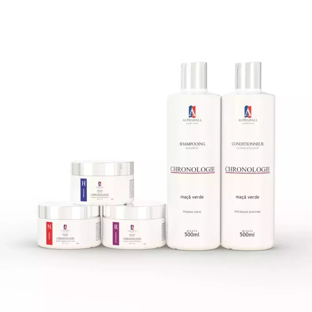 O KIT CONTÉM: - Shampoo maçã verde Cronograma (500ml/1L): higieniza o couro cabeludo removendo os resíduos acumulados no dia a dia, enquanto doa brilho natural aos fios. - Máscara de hidratação Cronograma (300g/1kg): Auxilia na reposição da umidade capilar e melhora o aspecto dos fios. - Máscara de nutrição Cronograma (300g/1kg): Repõe os óleos, protege o cabelo do ressecamento e porosidade. - Máscara de reconstrução Cronograma (300g/1kg): Restaura poderosamente a fibra capilar e repõe as proteínas necessárias para os fios. - Condicionadormaçã verde Cronograma (500ml/1L): Auxilia no selamento das cutículas,maior facilidade no desembaraço e penteabilidade.