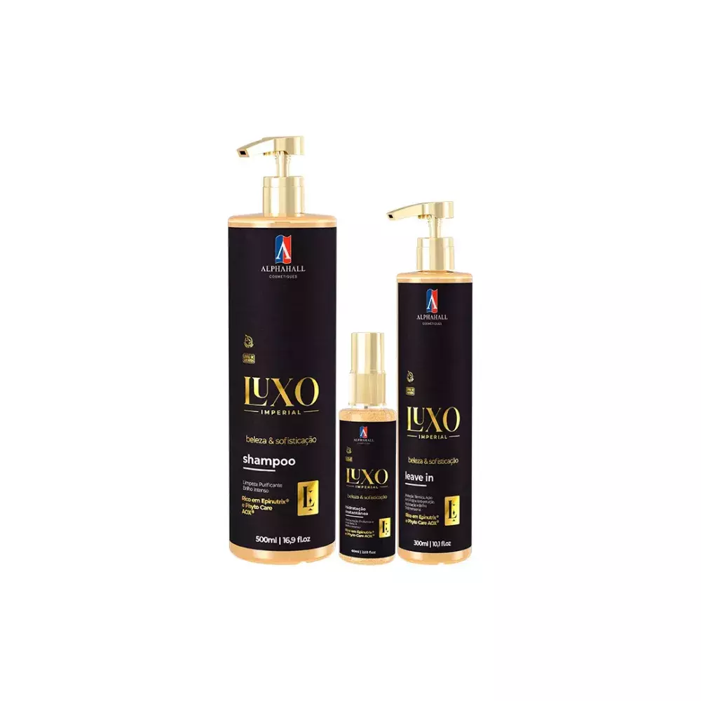 O KIT CONTÉM: - Shampoo Luxo Imperial (500ml): Limpeza e restauração do couro cabeludo. - Máscara Instantânea Luxo Imperial (60ml): Preenchimento da fibra capilar, reconstrução profunda e rápida. - Leave-In/ Creme de Pentear Luxo Imperial (300ml): Finalizador que ilumina os fios, promove sedosidade, maciez, possui ação antifrizz, antipoluição e brilho tridimensional. Além de ter proteção térmica para utilizar tranquilamente fontes de calor.