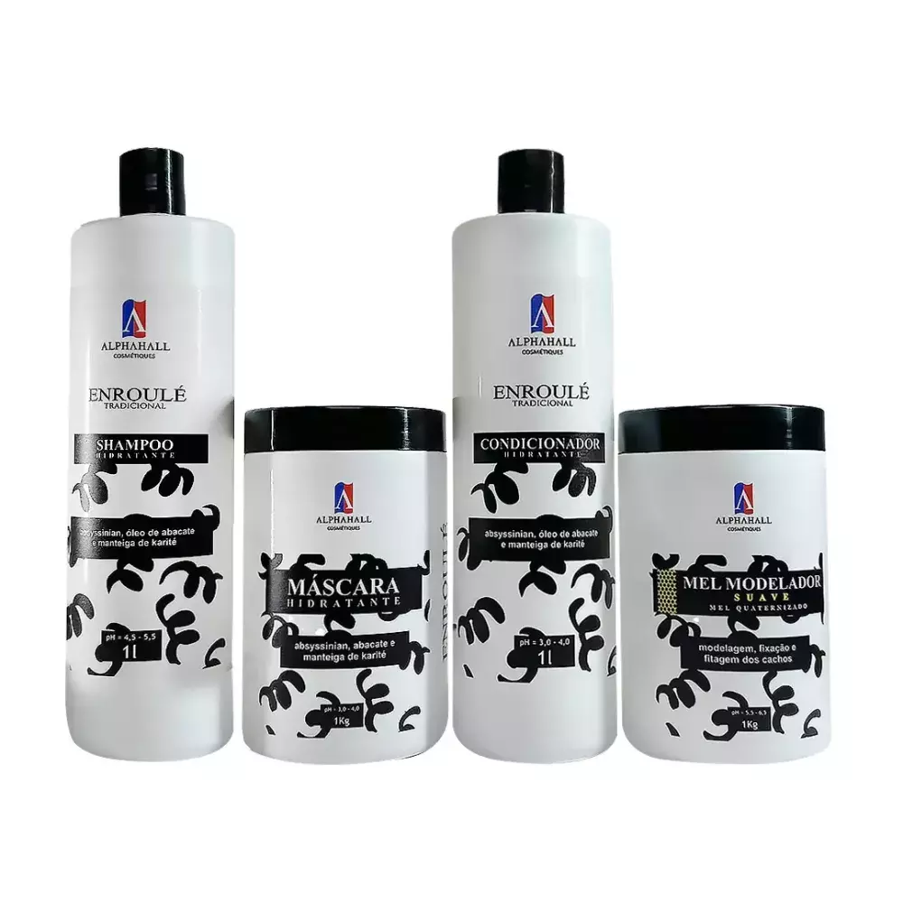 O KIT CONTÉM: - Shampoo Enroulé Modelador (1L): limpeza suave, removendo impurezas enquanto mantém a hidratação dos fios. - Máscara Hidratante Enroulé Modelador (1kg): promove hidratação e nutrição, devolvendo a vitalidade do cabelo, restaura cabelos secos e danificados, deixando os cachos definidos e saudáveis. - Condicionador Enroulé Modelador (1L): Sela as cutículas e facilita o desembaraço dos fios. - Mel Modelador Enroulé (1kg): O Mel Modelador da Alphahall, também conhecido como ?Mel Cola?, é um produto que oferece fixação e definição aos cabelos. Sua fórmula contém mel quaternizado, um ingrediente que ajuda a manter a hidratação e resistência dos fios. Além de proporcionar um acabamento duradouro, o Mel Modelador prolonga o day after, mantendo o estilo e a definição por mais tempo. Ideal para quem busca uma finalização de longa duração com toque suave e hidratado. Pode ser usado em cabelos naturais e orgânicos.