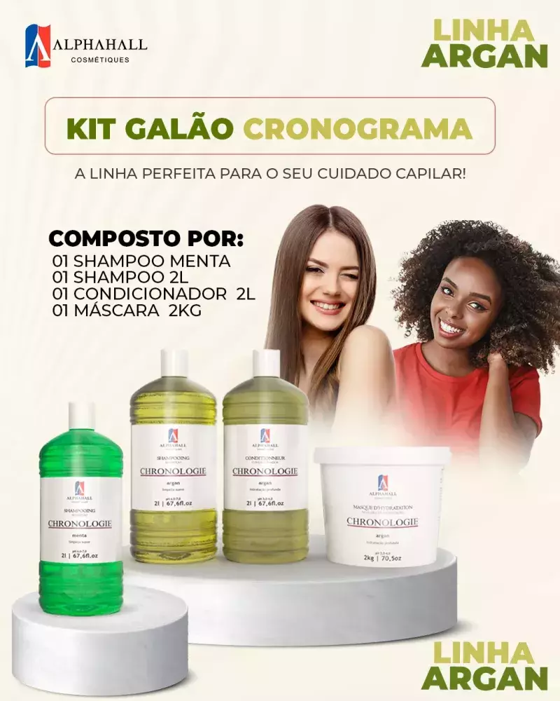 BENEFÍCIOS: - Formulado com Óleo de Argan, proporciona hidratação profunda, combate o frizz e aumenta o brilho, deixando os cabelos mais alinhados e saudáveis. - Ideal para todos os tipos de cabelo, esse kit oferece tratamento especializado para cabelos desidratados. - Com embalagens grandes (2L e 2kg) para uso contínuo, oferece excelente relação custo-benefício e garante que o salão atenda a uma grande demanda com mais economia.